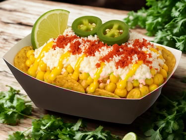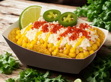 Your choice of chips from Tostitos Salsa Verde, Doritos, or Flammin' Hot Cheetos, Corn, Mayo, Butter, Cotija Cheese, Tajin, Chamoy, Jalapeños, Lime Wedges & Flammin' Hot Cheetos Crumbs