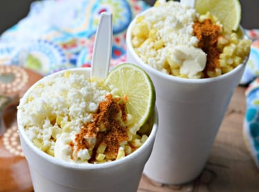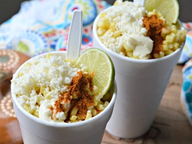 White and Yellow Corn, Mayo, Butter, Cotija Cheese, Taijn, Jalapeños, Lime Wedges & Flammin' Hot Cheetos Crumbs