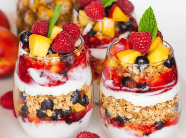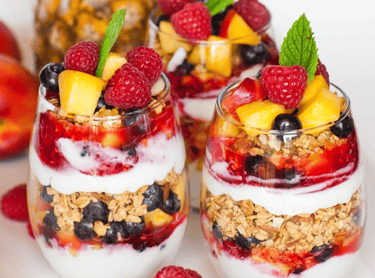 3 Yogurt Flavors, Bananas, Strawberries, Raspberries, Blueberries, Shaved Coconut Flakes, Nuts, 2 Granola Choices, Sauces & Honey