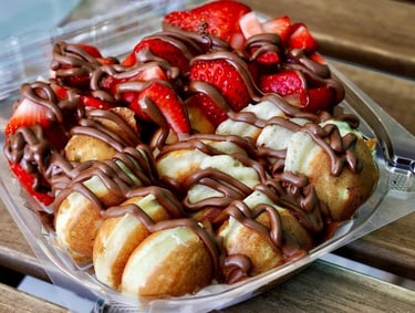 Mini Pancakes, 3-4 Fruit Choices, 3-4 Drizzles, 3-8 Topping Choices, Powdered Sugar & Syrup